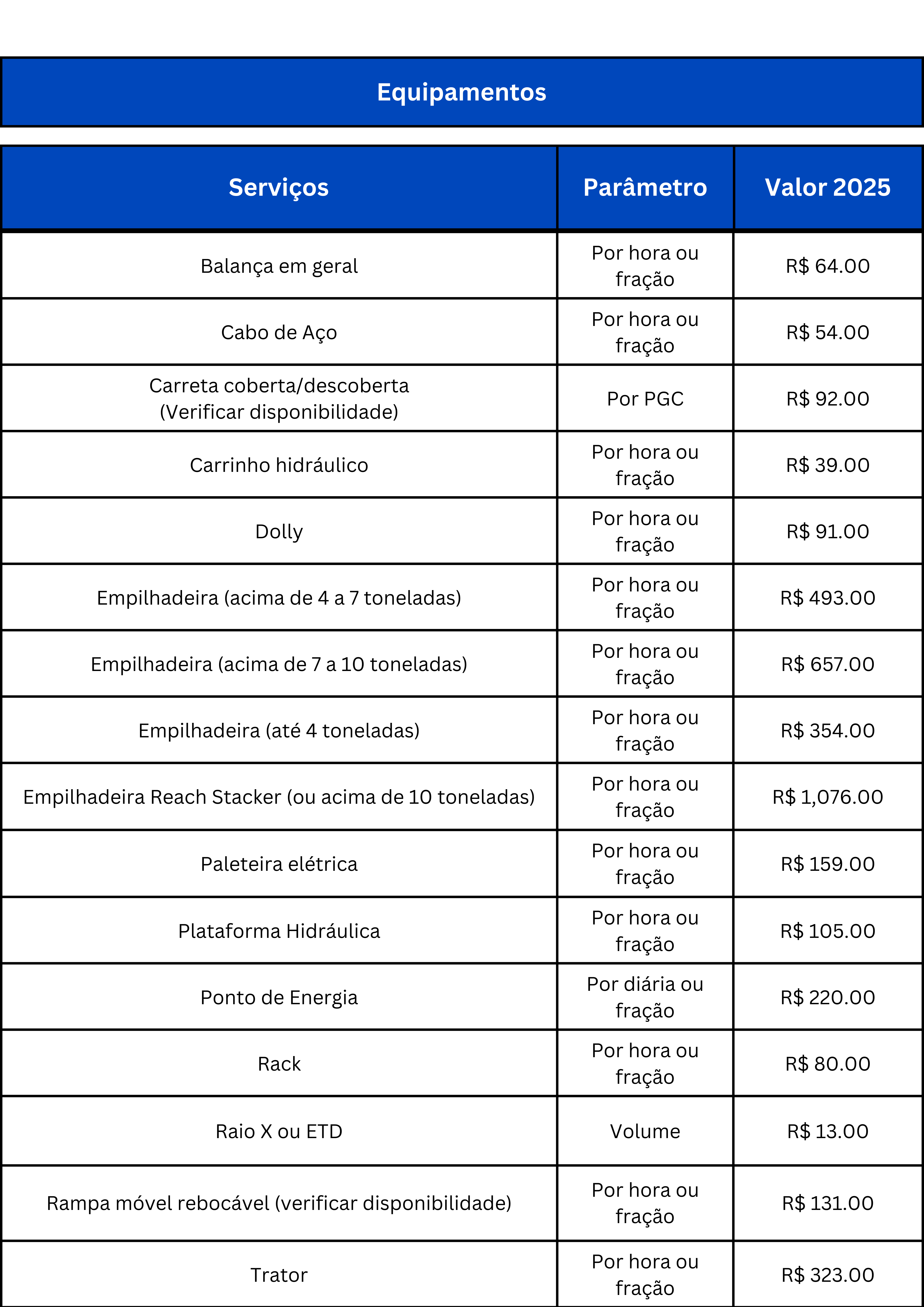 Informamos que a partir de 14 de fevereiro de 2025 entrará em vigor a nova tabela de preços específicos, com os devidos reajustes e nova modalidade de cobrança de carregamento e descarregamento.